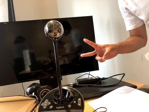 この機械を使ってオンライン会議すれば、相手の顔はテレビ映るし、こちらの映像&音声はこの機械が拾ってくれます。ハイテク!