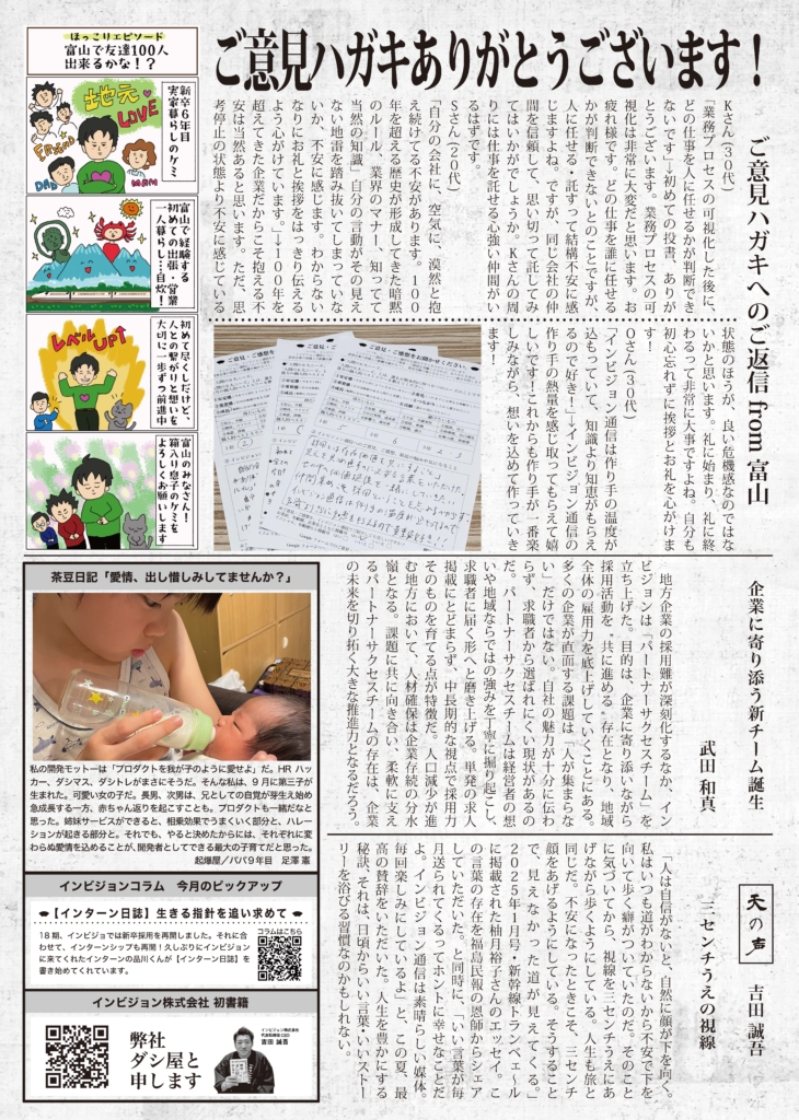 インビジョン通信は、毎月インビジョンのトピックスをまとめた新聞風月報「インビジョン通信」は紙でステークホルダーの皆様へ送っているものです。