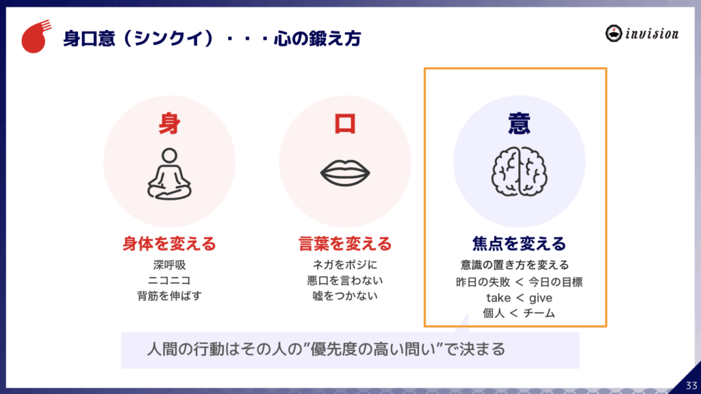 インビジョンの行動指針「おダシ十ヶ条」にも「大事なことは直火で話せ」という項目がある。